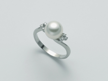 Anello in oro bianco 18kt, diamanti e perle Akoya di Nimei Cielo Venezie 1270. Anello classico ed elegante con 1 perla Akoya e 4 diamanti taglio brillante per un totale di 3,3 punti colore G purezza SI. Su richiesta disponibile in tutte le misure.