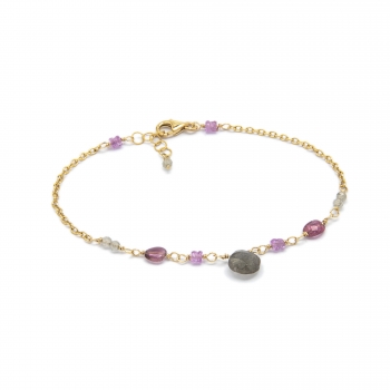 Elegante collana con crisoprasi, ametiste e zaffiri rosa. La collana ha una circonferenza di 41cm regolabile fino a 43cm e dal centrale pende una cascata di catenelle lunga circa 7cm adornate da crisoprasi, ametiste e zaffiri rosa. La collana è interamente realizzata a mano in argento 925 placcato in oro giallo ad alto spessore e ad alta resistenza. Indossali per impreziosire il tuo look con un gioiello semplice ma chic! Il gioiello verrà spedito con scatola e garanzia originali Ishwara.